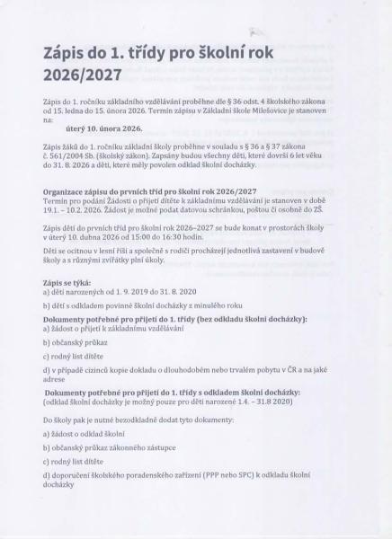 Zápis do 1. třídy pro školní rok 2026/2027